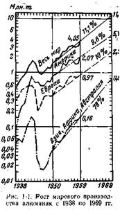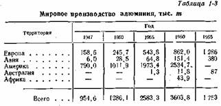 После второй мировой войны отмечен быстрый рост производства алюминиевой продукции в мире. Выплавка технического алюминия увеличилась в 4,5 раза. В табл. 1-3 представлены данные мирового производства алюминия.