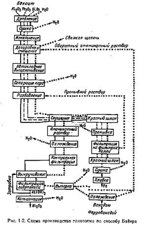 Способ переработки руды выбирают в зависимости от природы содержащихся в ней алюминиевых минералов. Гидроокиси алюминия растворяются в крепких щелочах, а. с опутствующие им соединения железа не растворяются. Поэтому щелочные растворы являются хорошим средством для разделения главных составных частей боксита.
