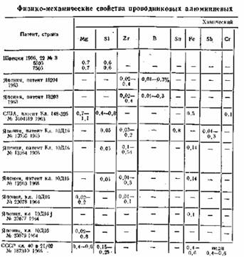В табл. 3-19 представлены патентные данные проводниковых алюминиевых сплавов, известных за рубежом и в СССР.