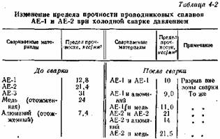 В табл. 4-2 представлены результаты испытания механической прочности сплавив АЕ-1 и АЕ-2 после холодной сварки.