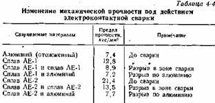 Механическая прочность соединений сплавов АЕ-1 и АЕ-2 между собой и с алюминием уменьшается резко по сравнению с холодной сваркой давлением. При сварке сплава АЕ-1 с АЕ-1 предел прочности уменьшается с 13 до 9 кгс/мм 2 , сплава АЕ-2 —от 21 до 13 кгс/мм2 (табл. 4-4).