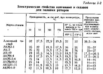 Для заливки роторов электродвигателей специального назначения (с повышенным скольжением, повышенным моментом и т. п.) должны применяться алюминиевые сплавы. В табл. 5-1 приведены составы этих сплавов и их проводимость. Как следует из табл. 5-1, каждому из значений проводимости удовлетворяют два сплава различного химического состава и различные по литейно-технологическим свойствам.