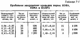 Эмальпровода марок ПЭВА, ПЭМА, ПЭЛРА выпускаются в диапазоне диаметров 0,08—2,44 мм, по толщине изоляции соответствуют медным проводам марки ПЭВ-2. По механическим и электрическим характеристикам эмалевой изоляции медные и алюминиевые провода примерно равноценны. Пробивное напряжение равномерно скрученного эмалированного провода должно быть не менее величин, указанных в табл. 7-1.