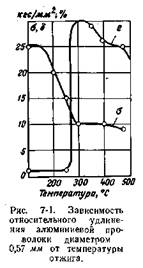 Получение алюминиевых эмальпроводов с необходимой величиной относительного удлинения встречает ряд технических трудностей. Это связано с резкой зависимостью величины относительного удлинения алюминиевой проволоки от температуры отжига. На рис. 7-1 показана зависимость величины относительного удлинения алюминиевой проволоки диаметром 0,57 мм от температуры отжига, полученная на заводе Южкабель (отжиг производился при непрерывном движении проволоки через электрическую печь отжига).