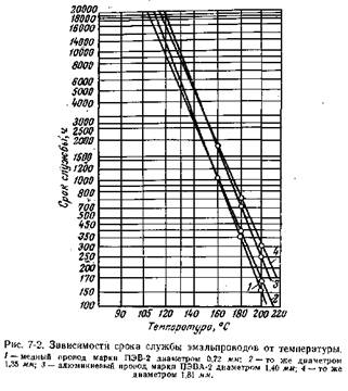 Медные провода с изоляцией на поливинилацеталевых лаках относятся по нагревостойкости к классу А. Алюминиевые провода имеют повышенную на один класс нагрево-стойкость. Так, на рис. 7-2 ,показаны зависимости срока службы медных и алюминиевых эмальпроводов с изоляцией на лаке винифлекс от температуры (методика испытаний по ГОСТ 10518-63 и 10519-63). Повышенная нагревостойкость алюминиевых эмальпроводов по сравнению с медными объясняется тем, что медь каталитически влияет на старение эмалевой изоляции, а алюминий в этом отношении более пассивен. Особый интерес представляет маслостойкость эмальпроводов в связи с тем, что при их применении в транс-форматоростроении взамен проводов с бумажной изоляцией удается заметно уменьшить габариты трансформаторов, получить экономию активных и конструкционных материалов и снизить добавочные потери в обмотках. Медные транспонированные провода с применением эмалевой изоляции широко используются рядом фирм для обмоток мощных трансформаторов и реакторов, например в США (General Electri ), Франции (Alstom ), Англии (English Electric ).