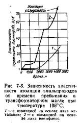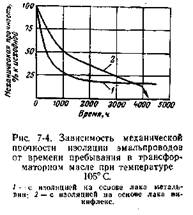 масле более интенсивно изменяют свои характеристики, чем с изоляцией на основе лака метальвин (рис. 7-3 и 7-4). Из анализа приведенных зависимостей следует, что уже после пребывания в горячем трансформаторном масле в течение I 500 ч провода с изоляцией на лаке винифлекс существенно снижают эластичность изоляции, а после 4 000 ч наступает разрушение изоляции.