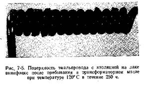 Работоспособность эмалевой изоляции в трансформаторном масле во многом зависит от химического взаимодействия масла и изоляции при воздействии рабочих температур. Из существующих алюминиевых эмальпроводов класса нагревостойкости А для масляных трансформаторов могут применяться провода с изоляцией на основе лака метальвин , так как эмалевая пленка на основе лака винифлекс нестойка к действию горячего трансформаторного масла. В частности, провода с изоляцией на основе лака винифлекс в процессе пребывания при температуре 105° С в трансформаторном