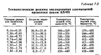 Оптимальные скорости эмалирования и температуры в эмалировочных печах при производстве эмальпроводов марки ПЭВА приведены в табл. 7-2.