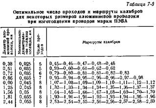 Оптимальные маршруты калибров для различных размеров алюминиевой проволоки при изготовлении проводов марки ПЭВА приведены в табл. 7-3.