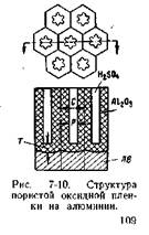 Использование несинусоидального переменного напряжения, у которого положительная полуволна (алюминий— ан од) больше, чем отрицательная (алюминий — катод), позволяет повысить производительность при оксидировании и обеспечивает получение эластичных изоляционных пленок. При этом в некоторых случаях плотность тока оксидирования достигает 3—4 а/смг , что сокращает время получения оптимальной толщины оксидной пленки в 20—30 раз по сравнению с оксидированием переменным напряжением и в 50—100 раз по сравнению с оксидированием постоянным напряжением. Гибкость пленки прямо пропорциональна ее пористости. Для увеличения пористости необходимо уменьшить размер шестигранных призм или ячеек (с порами посередине), являющихся элементами структуры оксидной пленки (рис. 7-10). Размеры отдельных элементов структуры определяются соотношениями