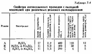 Этим объясняются отличия оксидированных проводов от эмальпроводов обычного типа. Основные свойства отечественных оксидированных проводов при различных режимах оксидирования приведены в табл. 7-4.