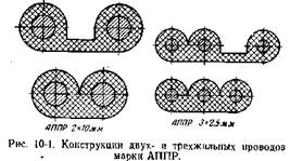 Провода марки АППР выпускаются в одно-, двух-, трех- и четырехжильном исполнениях сечением до 10 мм 2 . Двух- и трехжильные провода имеют плоское исполнение (рис. 10-1), причем предусматривается два варианта способов крепления проводов: гвоздями и скобами. В случае крепления гвоздями применяется провод с ленточным основанием между жилами; если крепление производится скобами, то ленточное основание отсутствует, а жилы расположены параллельно и непосредственно примыкают одна к другой. Четырехжильные провода изготовляются скрученными с небольшим шагом, что придает конструкции достаточную устойчивость.