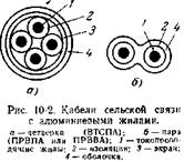 Одночетверочные и однопарные кабели с алюминиевыми жилами (рис. 10-2) применяются для сельской (внутрирайонной) телефонной связи и радиовещания. Одночетверочный кабель марки ВТСПА имеет толщину полиэтиленовой изоляции 0,7—0,8 мм. Поверх скрутки накладывается полиэтиленовая оболочка и алюминиевый или сталеалюминиевый ленточный экран. По экрану имеется защитная оболочка из поливинилхлоридного пластиката. Кабель имеет наружный диаметр 10—11 мм и используется для уплотнения с 3, 12, 24 и 30-канальной аппаратурой. Однопарные кабели сельской связи марки ПРППА или ПРПВА имеют изоляцию из полиэтилена и оболочку из полиэтилена или поливинилхлоридного пластиката.