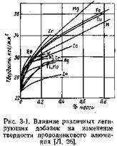 Упрочнение твердого раствора на основе алюминия зависит также от предела растворимости легирующего элемента; чем больше предел растворимости, тем интенсивнее упрочнение. М. Захаров и Т. Лисовская, исследуя влияние различных легирующих элементов на электропроводность и прочность алюминия, показали, что наибольший рост твердости отмечается при введении малорастворимых легирующих элементов: железа циркония, марганца, хрома, титана, кальция, магния. Эти элементы существенно отличаются по атомным диаметрам от алюминия. Хорошо растворимые цинк и серебро оказывают меньший эффект на упрочнение, что показано на рис. 3-1.