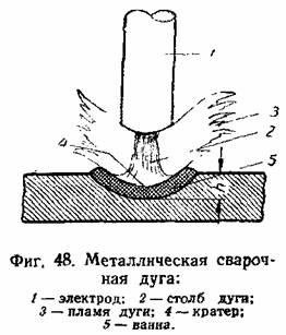 В установившейся сварочной металлической дуге, схематически показанной на фиг. 48, конец электродного стержня и поверхность изделия расплавлены, так что дуга горит между жидкими электродами. Столб дуги имеет обычно коническую или сфероидальную форму, расширенную от электродного стержня к изделию. Пламя имеет значительные размеры и содержит главным образом пары материала электродов, реагирующие с окружающим атмосферным воздухом. Поверхность жидкой ванны на изделии не остаётся плоско горизонтальной, так как действием механических сил, создаваемых дугой, или так называемого дутья дуги поверхность жидкого металла вдавливается. Образующееся углубление или ямка в жидком металле называется кратером. Длина дуги в нормальных условиях сварки должна быть малой; обычно она меньше диаметра применяемого электрода и колеблется в пределах 2—4 мм. Действием дуги металл расплавляется на глубину h называемую глубиной расплавления или глубиной провара или просто проваром.