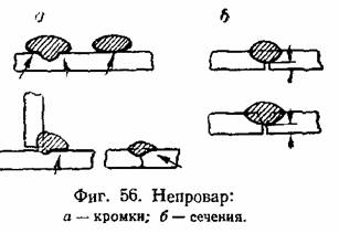 При нарушениях нормального процесса сварки могут возникать различные дефекты в строении валика. Одним из наиболее опасных дефектов является непровар , заключающийся в отсутствии сплавления между наплавленным и основным металлом. Непровар возникает при попадании расплавленного электродного металла на нерасплавленный основной металл. По поверхности соприкосновения сохраняется тонкая окисная плёнка, разделяющая наплавленный металл от основного и снижающая прочность сцепления между ними. Примеры непровара показаны на фиг. 56. Причинами непровара могут быть неправильное ведение процесса сварки, загрязнение поверхности металла, недостаточный ток и т. д. Непровар является дефектом, трудно обнаруживаемым при последующем контроле, а поэтому совершенно не допускается в ответственных сварных изделиях.