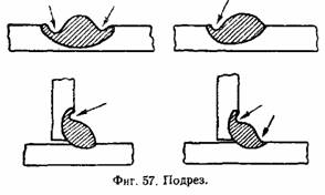 На фиг. 57 изображён подрез, т. е. углубление, идущее вдоль линии соприкосновения наплавленного металла с поверхностью основного.