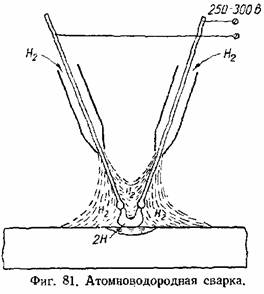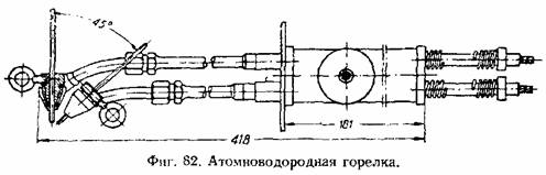 По характеру процесса атомноводородную сварку правильнее отнести к группе газовой сварки. Электрическая энергия в дуге создаёт атомный водород, который, сгорая, образует атомново-дородное пламя, расплавляющее металл. Нагревание водорода происходит, главным образом, за счёт столба дуги, которому стараются придать значительную длину, поэтому напряжение дуги при атомноводородной сварке обычно составляет от 70 до 150 в, в среднем 100 в. Переменный ток применяется для уменьшения расхода электродов и получения более симметричной формы дуги. Ввиду значительного напряжения атомноводородной дуги для питания её применяются специальные сварочные трансформаторы с повышенным напряжением холостого хода, обычно около 300 в и специальными устройствами для защиты сварщика от поражения током. Атомноводородная горелка показана на фиг. 82.