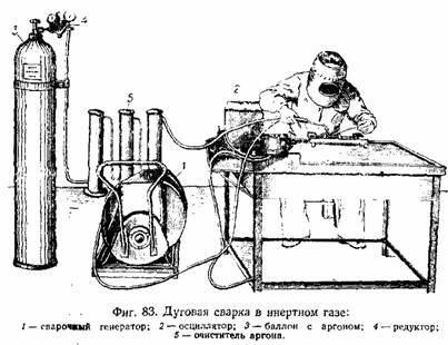 В последние годы началось применение при дуговой сварке защитных инертных газов нулевой группы периодической системы элементов. Промышленное применение получили из газов этой группы гелий и аргон. Как известно, газы нулевой группы химически совершенно инертны и не вступают ни п какие химические реакции ни с какими веществами. Способ дуговой сварки в инертном газе показан на фиг. 83. Сварочная дуга зажигаете между вольфрамовым электродом и основным металлом, защитный газ подаётся по мундштуку, охватывающему электрод (фиг. 80,6).