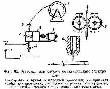 Для осуществления процесса автоматической сварки требуется целый комплекс машин, механизмов и приспособлений, образующий автоматическую установку для дуговой электросварки. Устройство, производящее зажигание дуги, подачу электродов по мере сгорания и обеспечивающее устойчивое горение дуги, называется автоматической головкой для дуговой сварки или дуговым автоматом. Наиболее важное промышленное значение естественно имеют автоматы для сварки металлическим электродом. Устройство дугового автомата для сварки металлическим электродом схематически показано на фиг. 85. Общая идея устройства автомата заключается в следующем: вместо отдельных коротких электродов, применяемых в процессе ручной сварки, при автоматической сварке используется электродная проволока большой длины в форме мотка или бухты (весом до 50 кг) сматываемая механизмом автомата и подаваемая в зону дуги по мере сгорания. Проволоке подаётся через передаточный механизм и ведущие ролики небольшим приводным электродвигателем автомата мощностью около J 00 вт . Пройдя ведущие ролики, а также часто и правильный механизм, устраняющий кривизну и придающий сматываемой с бухты проволоке прямолинейность, она поступает в мундштук или токоподвод автомата, где проволока прижимается к токоведущим контактам и скользит по ним, получая сварочный ток, питающий дугу.