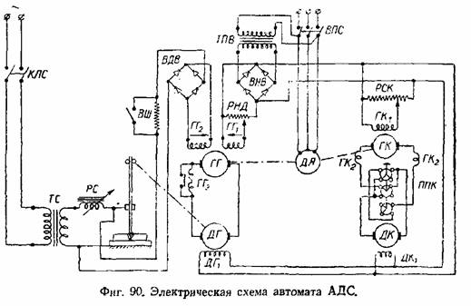 Автомат обычно применяется для сварки под флюсом дутой переменного тока; принципиальная электрическая схема показана на фиг. 90. Питание дуги производится от сварочного трансформатора ТС через дроссельный регулятор PC. Питание приводного электродвигателя автомата ДГ постоянного тока производится от вспомогательного управляющего агрегата, состоящего из электродвигателя трёхфазного тока ДА и непосредственно соединённых с ним генераторов постоянного тока ГГ и ГК. Генератор ГГ питает электродвигатель автомата ДГ, а генератор ГК — электродвигатель каретки ДК, служащий для перемещения дуги вдоль шва. Для питания постоянным током обмоток возбуждения генераторов и электродвигателей постоянного тока служат два статических двухполу-периодных выпрямителя ВДВ и ВНВ.