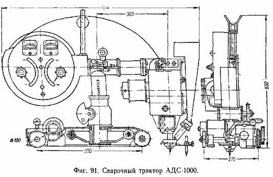 Генератор ГК питает элетродвигатель перемещения дуги ДК, работающий с постоянной скоростью, регулируемой потенциометром РСК; направление перемещения меняется переключением направления тока, питающего якорь мотора ДК. Обычно автомат АДС-1000 выполняется в форме сварочного трактора с двумя электродвигателями (фиг. 91). Электродвигатель ДГ производит подачу проволоки, а электродвигатель ДК перемещает самоходную каретку трактора. Автомат АДС-1000 предназначается для сварки под флюсом токами до 1200 а проволокой диаметром от 3 до 6 мм. Трактор без флюса и электродной проволоки весит около 65 кг. По своим сварочным свойствам автомат АДС может быть признан одним из лучших современных автоматов.