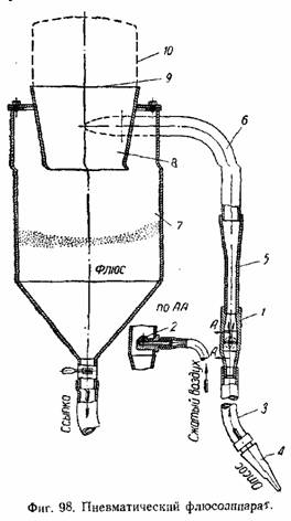 вание флюса вместе с всасываемым в камеру наружным воздухом. Устройство флюсоаппарата смешанного действия, позволяющее производить одновременно отсос и засыпку флюса и осуществлять непрерывную его циркуляцию, показано на фиг. 98. Сжатый воздух из сети поступает с большой скоростью в камеру инжектора 1 через сопло 2 и создаёт разрежение в шланге 5, всасывающем флюс с наружным воздухом через сосун 4. Скорость движения воздуха во всасывающей части подобрана таким образом (порядка 20 м/сек), что частицы флюса находятся во взвешенном состоянии и движутся вместе со струёй воздуха.