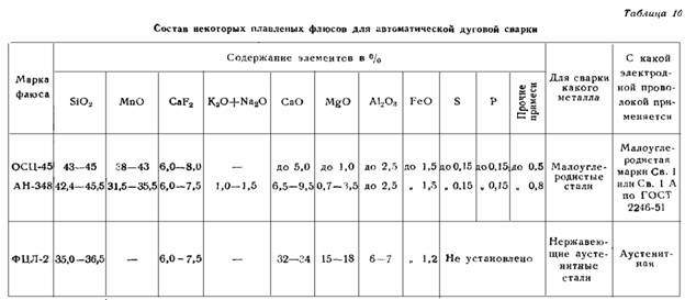 Во флюсе можно различать: 1) основу, 2) добавки, 3) примеси и загрязнения. Основой флюса являются обычно двойной или тройной силикат закиси марганца, окиси кальция, окиси магния, алюминия и т. д. В качестве добавки, снижающей температуру плавления и вязкость, чаще всего используется плавиковый шпат. Из примесей и загрязнений, попадающих во флюс вместе с исходными материалами и топливом, а также из футеровки печей, наиболее важны закись железа FeO , окись алюминия А1203, сера и фосфор. Все эти примеси и загрязнения вредны для флюса, и их предельное содержание ограничивается техническими условиями. Состав некоторых плавленых флюсов дан в табл. 10.