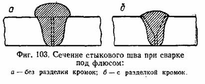 Сварка под флюсом в большинстве случаев обеспечивает провар всей толщины без всякой разделки кромок; необходимость разделки вызывается требованием получения надлежащей формы сечения шва. При сварке под флюсом практически отсутствуют потери металла на угар и разбрызгивание, весь электродный металл переходит в шов и во многих случаях при отсутствии разделки кромок придаёт сечению шва уродливую форму с чрезмерным избытком наплавленного металла, как это схематически показано на фиг. 103. Наличие разделки кромок позволяет убрать излишний наплавленный металл и придать сечению шва надлежащую форму. Поэтому для сварки под флюсом размеры разделки кромок в основном определяются количеством расплавленного электродного металла.