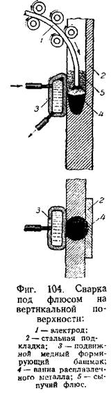 Первый практически пригодный метод автоматической сварки под флюсом на вертикальной поверхности разработал сотрудник института Г. 3. Волошкевич . На фиг. 104 показана сварка стыкового шва с остающейся подкладкой. Вдоль оси шва по поверхности основного металла перемещается снизу вверх формирующий медный башмак 3. Он движется равномерно вместе с электродной проволокой и автоматом (не показанным на фигуре). Электродная проволока подаётся системой роликов, изгибающих её так, что электрод располагается, примерно, на продольной оси шва. Сварочная ванна 4 жидкого металла приобретает вытянутую форму с небольшой свободной поверхностью под электродом, расположенной почти горизонтально. Ванна ограничена сзади подкладкой, а спредп формирующим башмаком, интенсивно охлаждаемым проточной водой и создающим благодаря этому корочку затвердевшего металла. При сварке без подкладки применяются два формирующих башмака, перемещающихся одновременно с передней и задней сторон шва. Флюс подаётся по мере надобности специальным дозатором; избыток шлака стекает и удаляется через верх формирующего башмака. Этот способ уже проверен при сварке кожухов доменных печей и имеет перспективы на значительное производственное применение после внесения дополнительных улучшений.