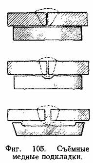 Существуют два основных способа применения медных подкладок (фиг. 105). В первом случае кромки собирают плотно без зазора, во втором случае сборка производится с зазором между листами в 3—4 мм и с зазором между подкладкой и основным металлом не менее 6 мм. Во втором случае флюс при засыпке просыпается через зазор и заполняет желобок под кладки.