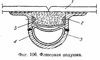 К изделию 1 снизу подводится стальное корыто 4, в которое заложен эластичный резиновый шланг 3. Флюс 2, образующий подушку, располагается на асбестовой ленте 5. При подаче сжатого воздуха шланг 3 раздувается и плотно поджигает флюс к изделию.