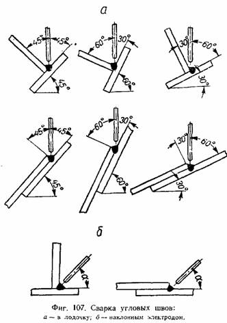Угловые швы. Сварка угловых швов производится: 1) вертикальным электродом в так называемую симметричную или несимметричную лодочку, 2) наклонным электродом (фиг. 107). Наилучшие результаты даёт сварка в лодочку, какую рекомендуется применять для угловых швов везде, где это возможно. При угловых швах также иногда приходится принимать меры против возможного протекания жидкого металла в зазоры. Для этой цели также применяются подкладки, подварка обратной стороны, сварка в два слоя, уплотнение зазоров асбестовым шнуром и т. д.