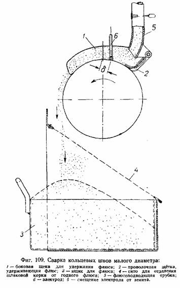 Кольцевые швы. Сварка под флюсом кольцевых швов в вертикальной плоскости, т. е. швов на поверхности поворачивающегося цилиндра, часто представляет затруднения, возрастающие с уменьшением диаметра цилиндра. При диаметрах свариваемого изделия менее 500 мм расплавленный металл и жидкий шлак вытекают из зоны сварки в сторону вращения изделия. Для удовлетворительной сварки кольцевых швов малого диаметра уменьшают сварочный ток, длину и напряжение дуги, скорость сварки; смещают электрод от зенита в направлении против вращения изделия