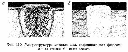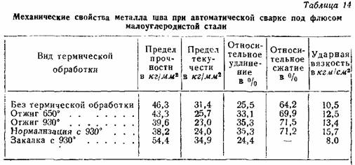 В особо ответственных изделиях грубозернистая дендритная структура наплавленного металла может быть устранена и превращена в мелкозернистую равноосную посредством отжига, повышающего пластичность. Механические свойства наплавленного металла и сварного стыкового соединения для сварки под флюсом малоуглеродистой стали при различной термообработке приведены в табл. 14, из которой видно, что по прочности и пластичности наплавленный металл не уступает прочности обычной малоуглеродистой стали.