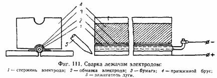 Способ сварки лежачим электродом, первоначально предложенный около 20 лет назад коллективом инженеров Ленинградского завода Электрик, был позже доработан коллективом инженеров Мытищинского завода под руководством инженеров П. В. Мумрикова и С. 3. Штерлинга , придавшим способу современную форму, допускающую его производственное использование. Сущность этого способа схематически изображена на фиг. 111.