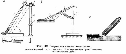 Способ сварки наклонным электродом, созданный работниками уральских заводов, известен в двух разновидностях, схематически показанных на фиг. 112: а) с постоянным углом наклона, не меняющимся в процессе сварки; б) с переменным углом наклона.