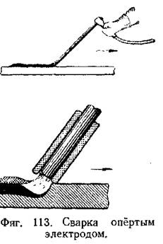 Способ сварки наклонным электродом сходен со способом сварки опёртым электродом, занимающим промежуточное положение между ручным и полуавтоматическим способами. Сущность этого способа показана на фиг. ИЗ. Электрод с толстым слоем механически прочной обмазки, расположенный под острым углом к поверхности изделия, опирается краем слоя обмазки о поверхность изделия, аналогично способу сварки наклонным электродом. Отличие заключается в том, что электрод закреплён не в штативе, а в обычном держателе электродов, находящемся в руке сварщика. Частичная автоматизация процесса состоит в том, что автоматически поддерживается постоянная длина дуги и автоматически происходит подача электрода в зону дуги по мере его плавления. Постоянство длины дуги обеспечивается постоянной величиной выступающей части обмазки на конце электрода, так называемого козырька, который почти не меняется в процессе сварки, поддерживая приблизительно неизменной длину дуги.