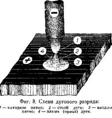 На фиг. 8 схематически изображён дуговой разряд при атмосферном давлении, питаемый постоянным током. Между положительным электродом — анодом и отрицательным — катодом расположена наиболее важная часть дугового разряда — положительный столб, или просто столб дугового разряда, имеющий обычно коническую или сферическую форму. Газ столба ослепительно ярко светится и имеет очень высокую температуру, порядка 6000°. Столб окружён пламенем или ореолом дуги, имеющим значительные размеры. Пламя образуется парами и газами, поступающими из столба дуги, взаимодействующими химически с окружающей атмосферой и постепенно охлаждающимися по мере удаления от оси столба. Газ столба сильно ионизирован.