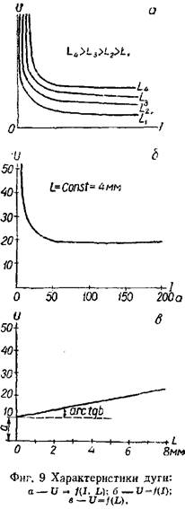 Наивысшая температура наблюдается в осевой части столба дуги, в нормальной сварочной дуге максимальная температура достигает 6000°. На поверхностях электродов в области электродных пятен температура обычно близка к температуре кипения материала электродов. Напряжение дуги, т.е. напряжение между концами её электродов, является сложной функцией длины дуги и силы тока в ней, а также существенно зависит от материала и размеров электродов, состава и давления газа и т. д. Опытная зависимость напряжения дуги от тока и её длины может быть выражена кривыми, имеющими форму, показанную на фиг. 9, а.