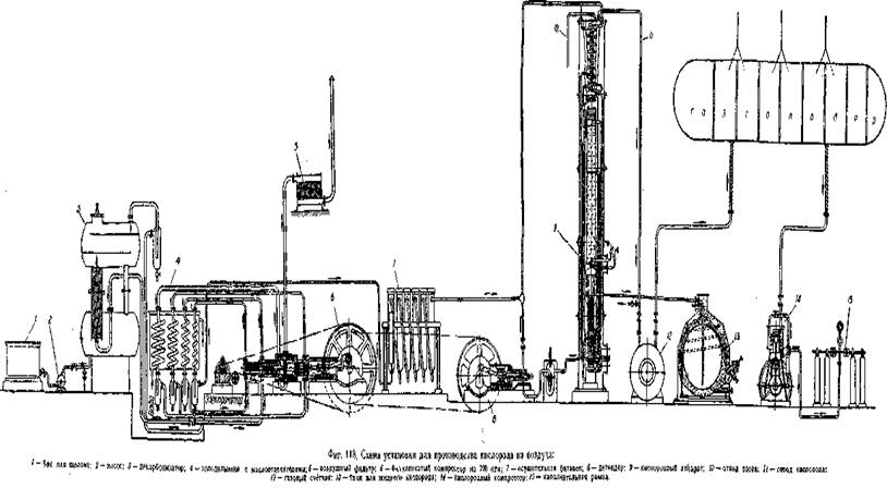 Схема заводской установки для производства кислорода из воздуха показана на фиг. 118. Воздух, засасываемый многоступенчатым компрессором, проходит сначала через воздушный фильтр, где очищается от пыли, затем проходит последовательно ступени компрессора (на фигуре изображён четырёхступенчатый компрессор). За каждой ступенью компрессора давление воздуха возрастает и доводится до 50—220 атм в зависимости от системы установки и стадии производства. После каждой ступени компрессора воздух