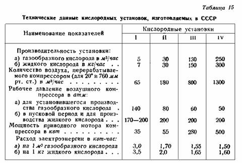 1 л жидкого кислорода весит 1,13 кг и, испаряясь, образует 0,79 м3 газообразного кислорода при 0° и 760 мм рт . ст. 1 кг жидкого кислорода занимет объём 0,885 л и, испаряясь, образует 0,70 м3 газообразного кислорода при 0° и 760 мм рт . ст. Технические данные стандартных кислородных установок, изготовляемых в Советском Союзе, приведены в табл. 15.