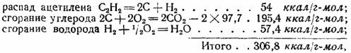 Ацетилен является эндотермическим химическим соединением, т. е. его образование из элементов углерода и водорода происходит с поглощением значительного количества энергии, а распадается он на элементы экзотермически с выделением того же количества энергии в форме тепла. Энергия, затрачиваемая на образование ацетилена или освобождающаяся при его распадении на элементы, составляет 54 ккал на 1 г-мол (26 г). Этого количества тепла достаточно для повышения температуры продуктов распада примерно на 3000°. Распад ацетилена происходит по уравнению