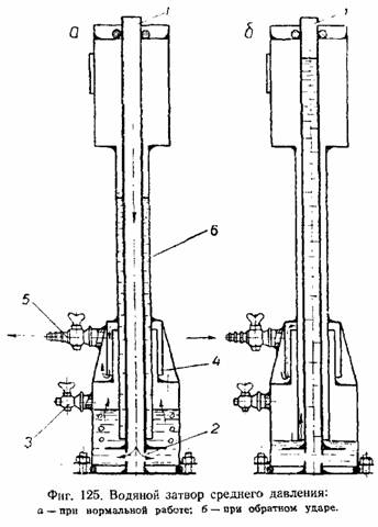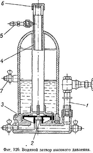 Существенно отлична конструкция водяных затворов высокого давления, которые изготовляются только закрытого типа, так как при открытом выполнении пришлось бы придавать предохранительной трубке чрезвычайно большую высоту — 10—15 м. В затворах высокого давления подводящая трубка перекрывается при обратном ударе обратным клапаном, а короткая предохранительная трубка закрывается тонкой металлической (обычно оловянной) мембраной, разрывающейся при обратном ударе и выпускающей газы в атмосферу. Предохранительная мембрана рассчитывается на давление около 2 ати и заменяется новой после разрыва, произведённого обратным ударом.