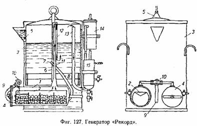 Реторты вварены в корпус 3 генератора и плотно закрываются крышками 4. Газгольдером служит плавающий колокол 5, имеющий предохранительную трубку 6 с открытыми концами. Нижний конец этой трубки погружён в воду, а верхний сообщается с атмосферой. К трубке 6 приварен патрубок 7 и на него надет резиновый шланг 8; другой конец шланга надет на трубку 9. Через трубку 9 и трёхходовой кран 10 можно подавать воду в одну из реторт, работающих попеременно, или прекращать подачу воды.