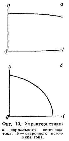 При такой внешней характеристике напряжение на зажимах будет снижаться с увеличением нагрузки и возрастать с её уменьшением (фиг. 10,6). Наличие падающей внешней характеристики делает возможным устойчивое горение дуги при определённой постоянной силе тока.