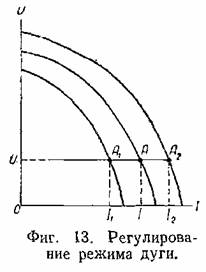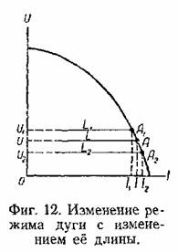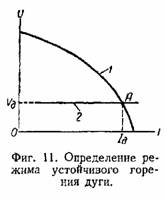 На фиг. 11 нанесены внешняя характеристика источника тока 1 и статическая характеристика дуги 2, пересекающиеся в точке Л, очевидно эта точка и изобразит режим устойчивого горения дуги при токе 1 и напряжении U.