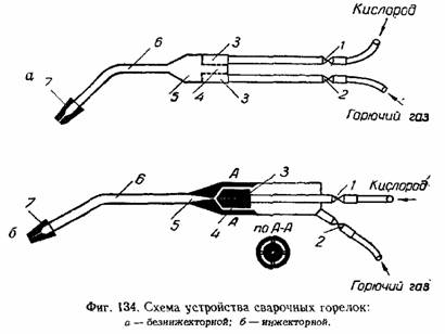 Устройство безинжекторной горелки высокого давления схематически показано на фиг. 134, а. Кислород поступает в горелку по резиновому шлангу и через приёмный ниппель и регулировочный вентиль 1 проходит в смеситель 5, где поток кислорода разбивается на тонкие струйки для лучшего смешивания с горючим газом, после чего проходит в сопло смешения 4. Совершенно аналогичный путь проходит горючий газ, поступающий в горелку через регулировочный вентиль 2. Из сопла смешения смесь горючего газа с кислородом поступает в камеру смешения 5, где вследствие увеличения сечения газового потока скорость его уменьшается и заканчивается смешение кислорода с горючим газом, дающих на выходе из камеры смешения однородную по всему объёму горючую смесь. Из камеры смешения 5 готовая смесь проходит по трубке наконечника 6 и через калиброванный канал мундштука 7 выходит наружу, где и сгорает, образуя сварочное пламя.