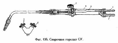 Для примера рассмотрим советскую инжекторную универсальную горелку СУ (фиг. 135), которая пригодна для сварки стали толщиной от 0,5 до 30 мм, для чего комплектная тарелка при одном стволе имеет восемь сменных наконечников № 0, 1, 2, 3, 4, 5у б и 7. Кислород поступает в горелку через трубку 5 и ниппель 1 на который надевается резиновый шланг. Ацетилен поступает через ниппель 2 в полую рукоятку 4. Расход газов регулируется вентилями 5 и 6, которые расположены, примерно, в середине рукоятки; что даёт сварщику возможность регулировать горелку, не прерывая работы, пальцами той же руки, которая держит рукоятку. Кроме того, такое расположение вентилей выгодно смещает центр тяжести горелки, улучшает баланс я уменьшает утомляемость сварщика. Кислород через регулировочный вентиль 5 поступает в центральный канал инжектора, а оттуда в камеру смешения и далее в трубку наконечника.