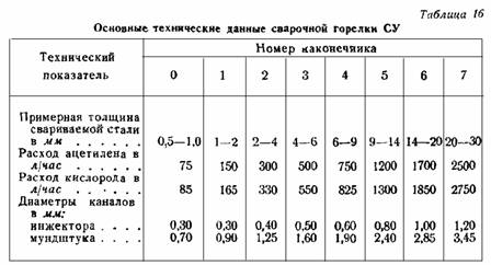Существенным преимуществом горелки СУ является постоянное давление кислорода, равное 3 атм для всех восьми наконечников. Основные технические характеристики различных номеров наконечников приведены в табл. 16.